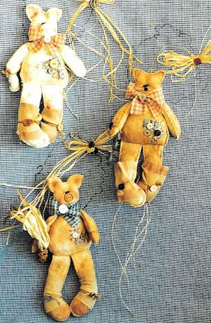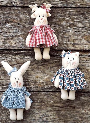 & Kitty These critters are fishing, playing, eating and just plain quick and easy to make. Pattern includes 6" bunny, cat and bear. |
