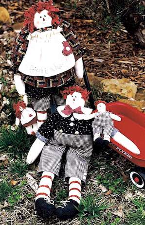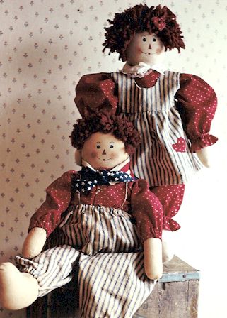 | 124 | Raggedy Twins Ticking and hearts make this pair of rag dolls irresistible. Pattern includes 22" boy and girl. |