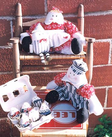 & Family Humpty Dumpty sat on a wall, instead of a fall he had a family. Pattern includes 13" boy and girl, 2" baby (makes a cute pin), and 4" Humpty with button legs and arms. |