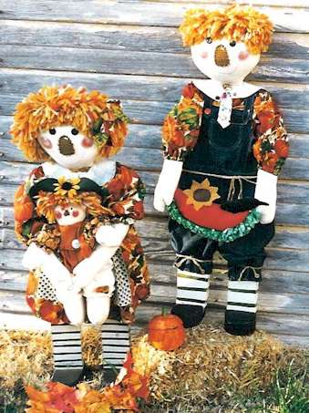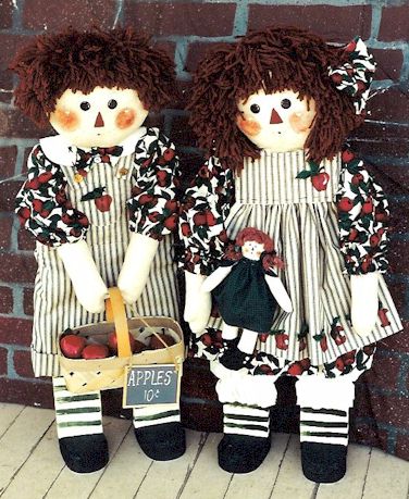 For Sale Raggedy Ann and Andy want to share their smiles and red juicy apples with you. Pattern includes 33" boy and girl and 10" rag doll. Made from an easy to cut wood base, full size pattern included, and fabric. |