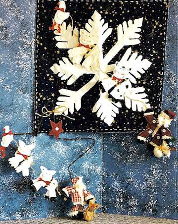 Yuletide Santa traded in Rudolph for a new herd of "reindeer". Pattern includes directions for making 18" barbed wire star, 6" Santa, cow, pig, duck and stars. Pattern also includes a snowflake wall hanging. |