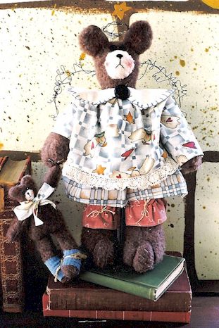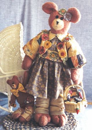Diane La Beara Amy with her sculpted toes and hands, and her baby are ready to go to the quilting bee. Pattern includes 24" and 10" bears. Made from cotton batting or plush felt with old quilt jacket and yo yos. |