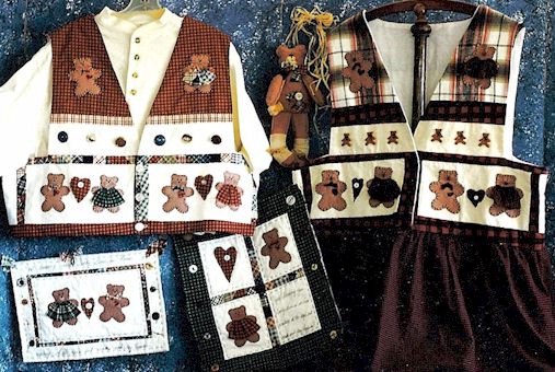 Hugs Welcome Just knowing your Teddy Bear is home waiting at the day’s end – makes each day happier. Pattern includes vest, jumper (S-XL), 15" wall hanging, 8" x 11" mini quilt and 11" bear. |