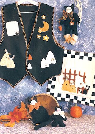 Critters Wooooo goes there? It's a black cat, a bunny pumpkin, a beary cute witch and a not very scary ghost. Pattern includes 6" critters and instructions for making a wreath and garland. |