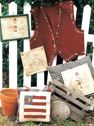 Love Three fun and easy samplers used as panels on the back of a vest, made into pillows or framed. Pattern includes flag, snowmen and rabbit stitcheries. |
