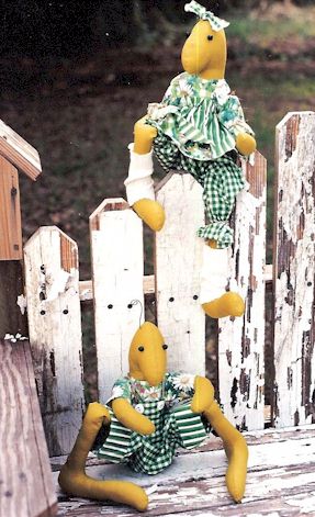 & Hedda Gobbler Horace & Hedda urge you to vote yes on the bill to abolish the turkey as the official Thanksgiving bird. Pattern includes 18" boy and girl turkey, 6" baby, pumpkins and cow sign. Wings are woven strips of fabric in the shape of a heart. |