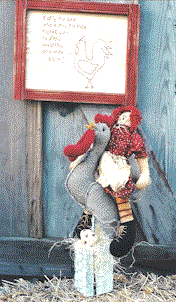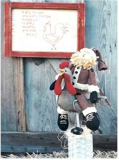 Chicken on a Stick Mr. Rooster stands proud and tall, Mr. Scarecrow won't scare away the crows.. Stitchery -- Early to bed, early to rise, makes you healthy, wealthy and wise -- NOT! Pattern include 18" scarecrow and a 22" chicken on a wood base. |