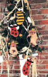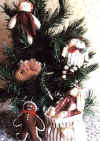 In my garden you will find a funny little evergreen with stockings and mittens to keep the little critters as snug as a bug in a rug. Pattern includes 6" mitten, and 9" stocking with a ladybug, a bumblebee and a grasshopper. Hang them on the tree with twisted wire. Very easy and quite unusual. |