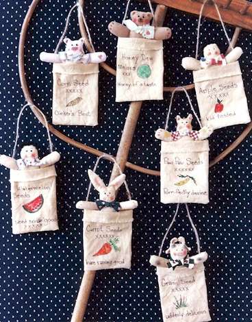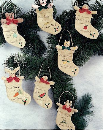 Packets Grass seed...udderly delicious; Paw Paw seeds ...purr-fectly divine. Pattern includes 6 1/2" rabbit, cow pig, boy, girl, bear and cat in easy to paint Christmas stocking seed packets. |