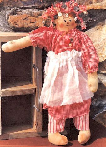 Jane Buttons and rags all braided together to adorn the head of this time worn Raggedy Ann. Pattern includes 16" doll. |