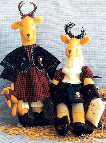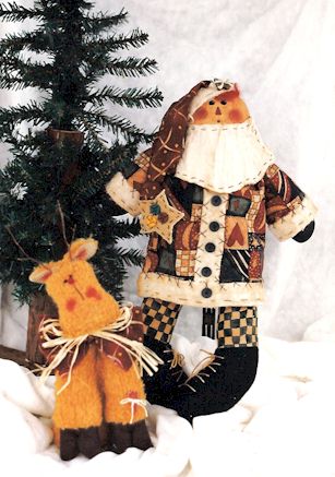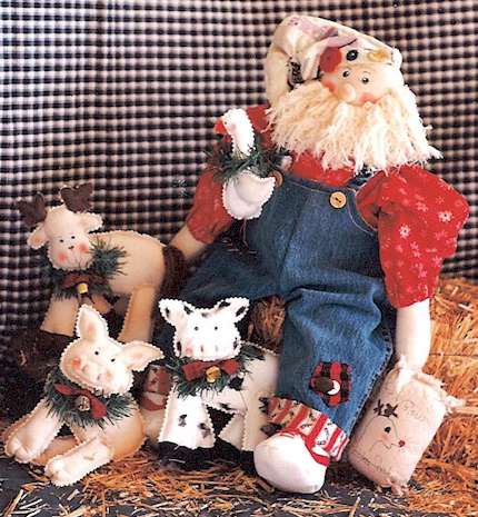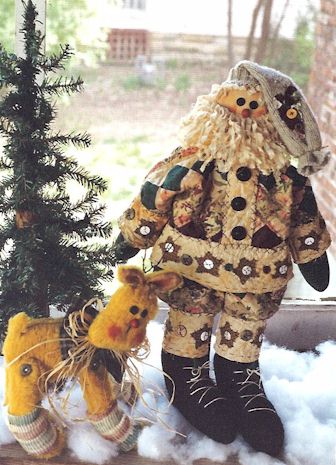 Claus Santa and his cutest reindeer are preparing for the season of joy and peace on earth. Pattern includes 24" Santa dressed in an old quilt with buttons and hearts and 12" reindeer with stockings |