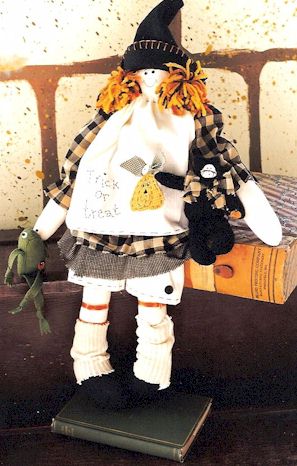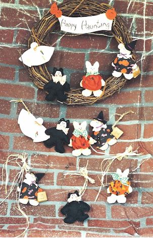 Critters Wooooo goes there? It's a black cat, a bunny pumpkin, a beary cute witch and a not very scary ghost. Pattern includes 6" critters and instructions for making a wreath and garland. |