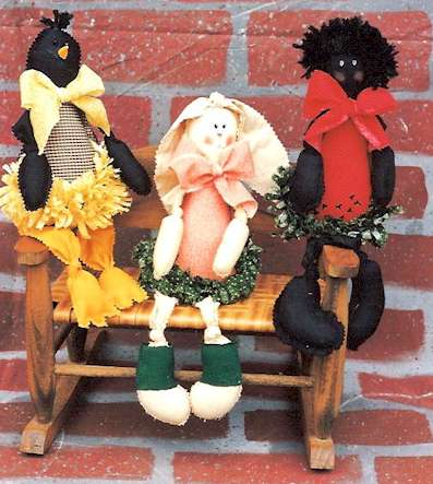 & Family Humpty Dumpty sat on a wall, instead of a fall he had a family. Pattern includes 13" boy and girl, 2" baby (makes a cute pin), and 4" Humpty with button legs and arms. |