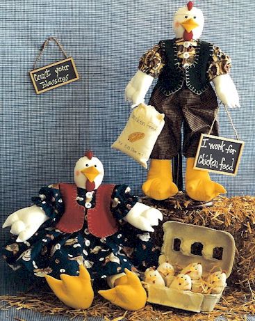 Cheeper If your order is sunny side up – Mama chicken and her baby chicks are "eggs"actly right. Papa is looking for a job – he’ll work for chicken feed. Pattern includes 18" boy and girl and 2" baby chicks |