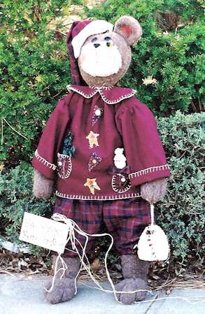 Diane La Beara Amy with her sculpted toes and hands, and her baby are ready to go to the quilting bee. Pattern includes 24" and 10" bears. Made from cotton batting or plush felt with old quilt jacket and yo yos. |