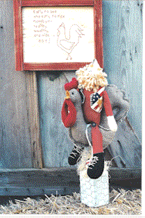 Chicken On Stick Mr. Rooster stands proud and tall, Raggedy Ann sends her love to all. -- Early to bed, early to rise, makes you healthy, wealthy and wise -- NOT! Pattern include 18" raggedy Ann and a 22" chicken on a wood base. |