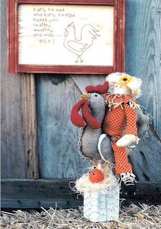 Chicken on a Stick Mr. Rooster stands proud and tall, Mr. Scarecrow won't scare away the crows.. Stitchery -- Early to bed, early to rise, makes you healthy, wealthy and wise -- NOT! Pattern include 18" scarecrow and a 22" chicken on a wood base. |