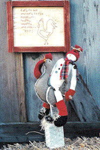 Chicken on a Stick Mr. Rooster stands proud and tall, we can build a snowman. Stitchery -- Early to bed, early to rise, makes you healthy, wealthy and wise -- NOT! Pattern include 18" snowman and a 22" chicken on a wood base. |