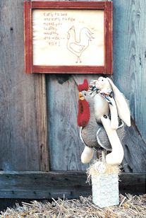 Chicken on a Stick Mr. Rooster stands proud and tall, Mr. Rabbit paints Easter eggs for all. Stitchery -- Early to bed, early to rise, makes you healthy, wealthy and wise -- NOT! Pattern include 18" rabbit and a 22" chicken on a wood base. |